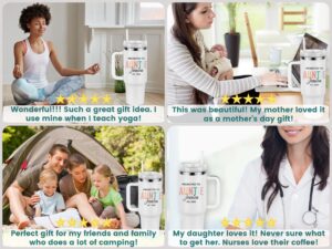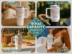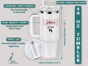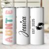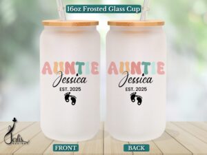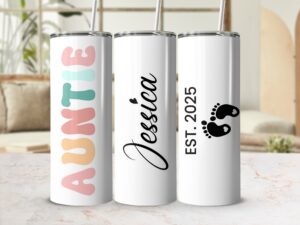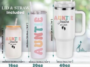 Show your Auntie some love with this adorable pregnancy announcement 40oz Tumbler, perfect for gifting or personal use. Celebrate the best Aunt ever with a retro design that includes her name, making it a unique and special gift.