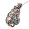 I created this unique, wire wrapped turquoise necklace, by weaving various gauges of fine silver and sterling silver wires, into this elegant and intricate gemstone jewelry.